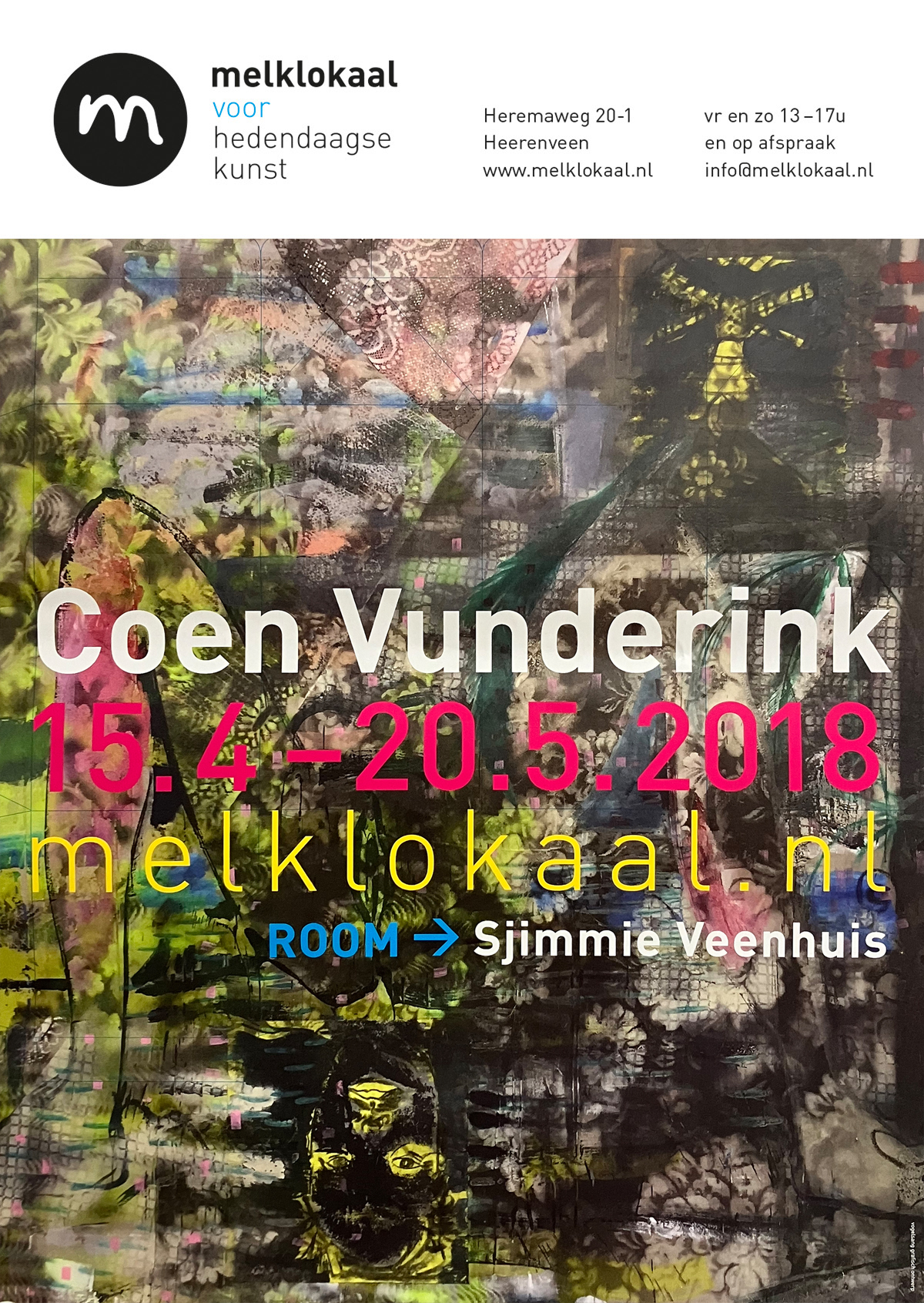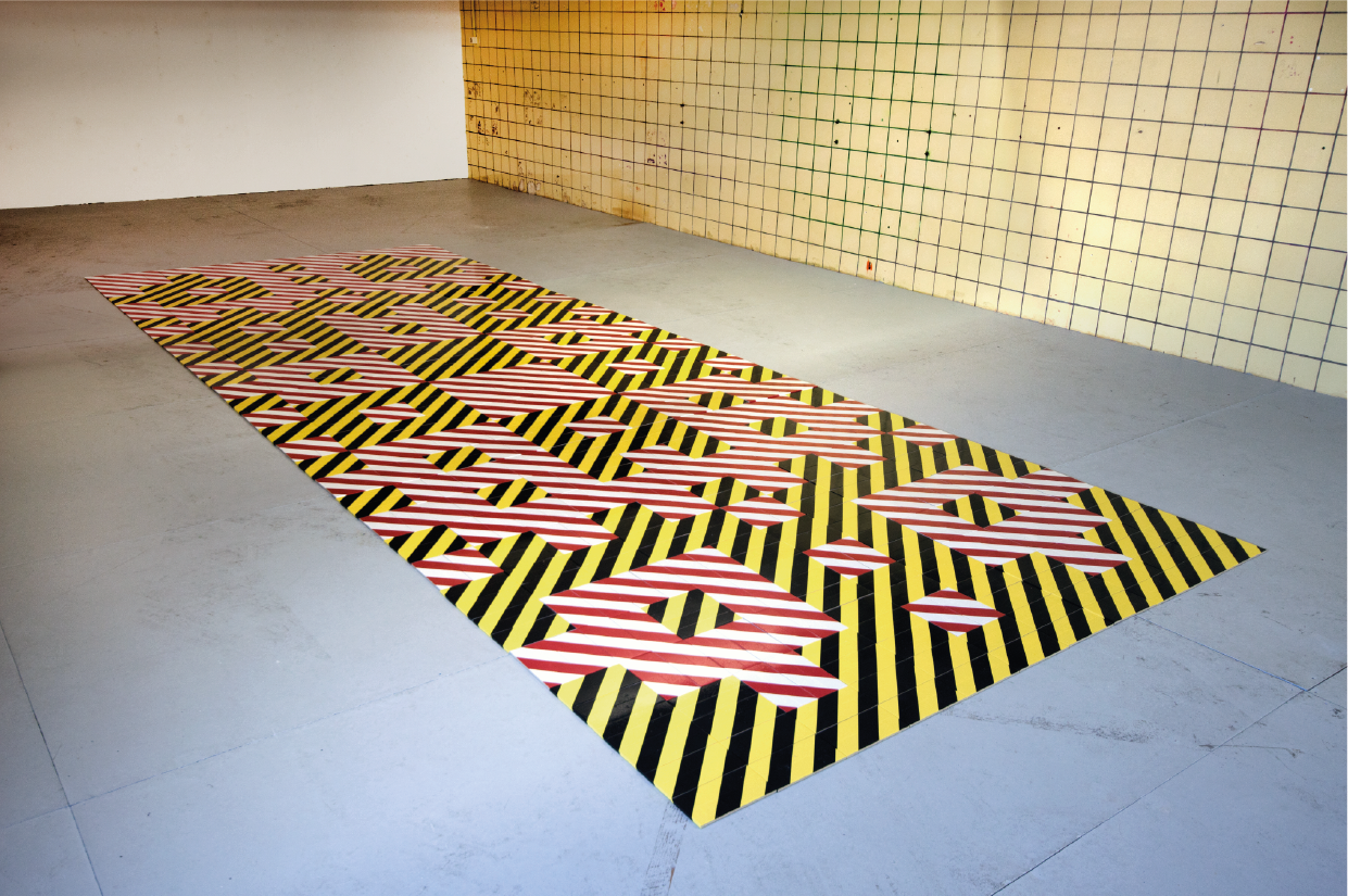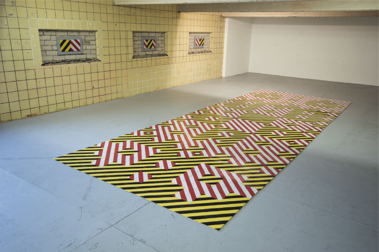 “On the top floor of Melklokaal I find a tile tableau by Sjimmie Veenhuis in ROOM. By covering half tiles with red-white and black-yellow warning tape, he can build a pattern that will look different in every room. This “Excerpts” is therefore a site-specific installation. The three possible shapes that can be used in the bigger picture are placed on the wall. No lines may cross, which means the possibilities are limited. Veenhuis manages to create a powerful puzzle with it. The plastic shines in the light and disappears completely in places, so that, viewed from every side, the floor is moving due to lines and reflections.” [1]