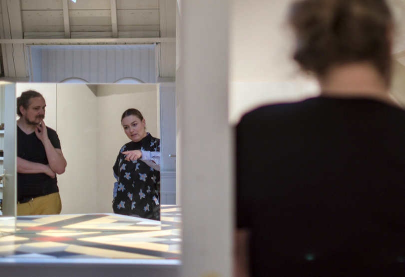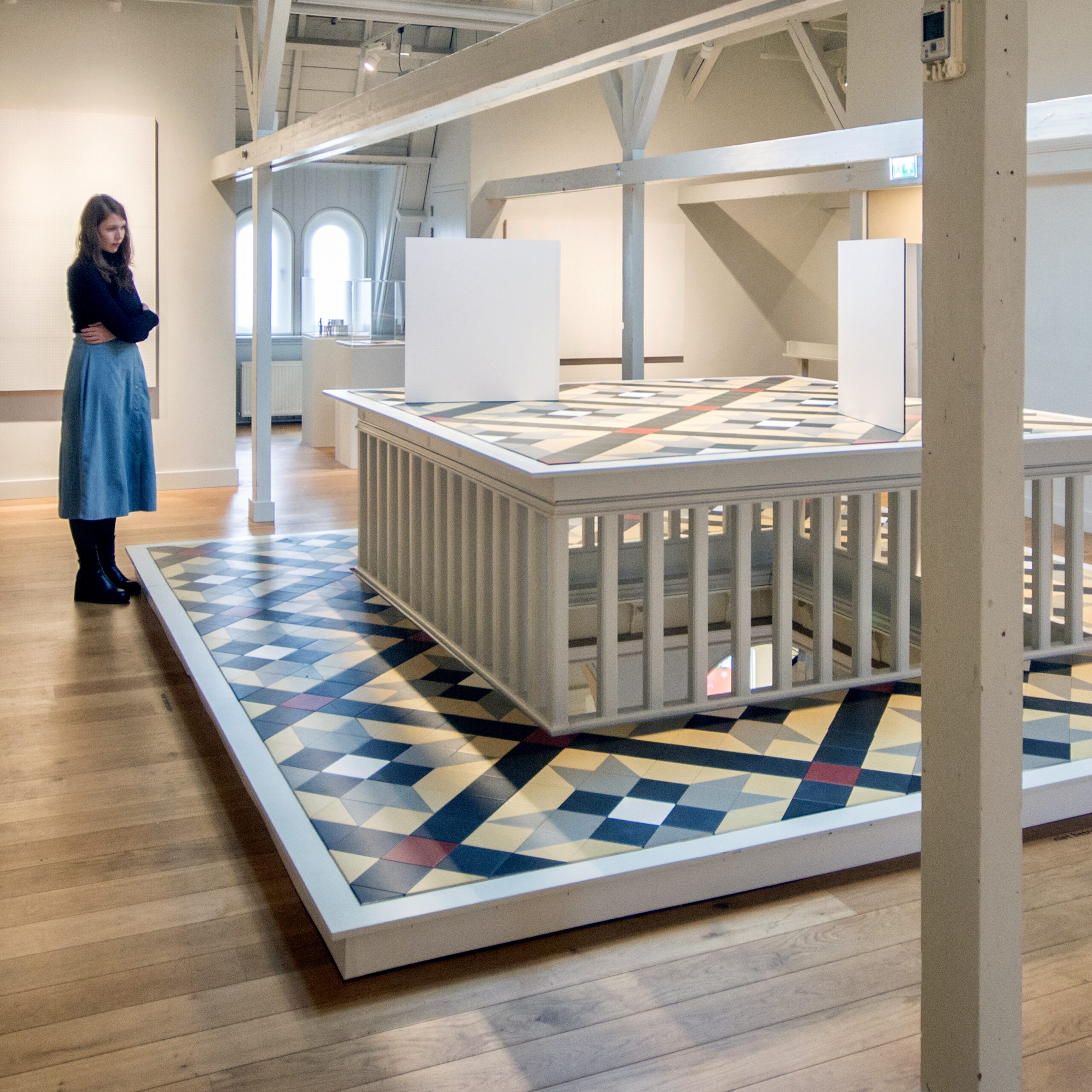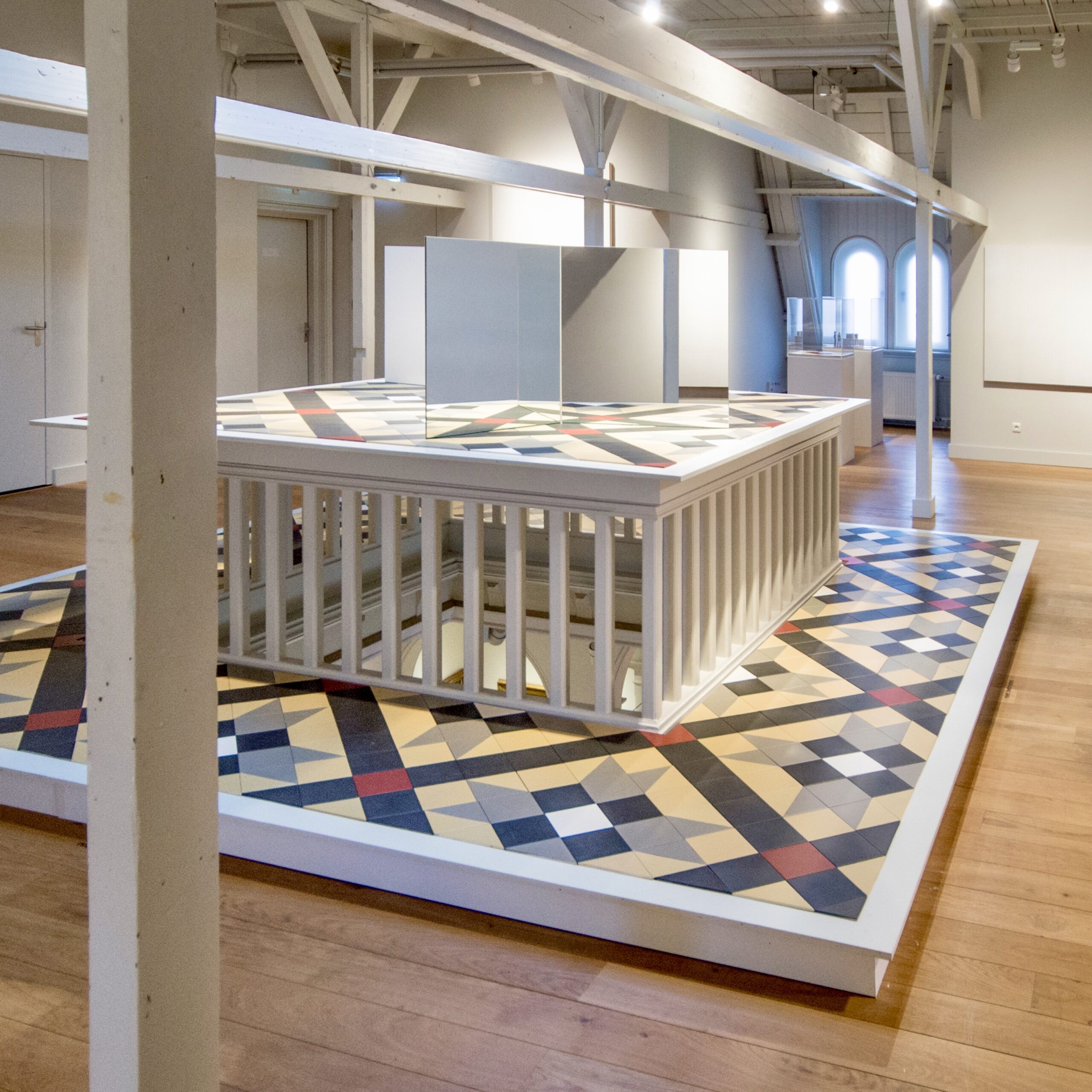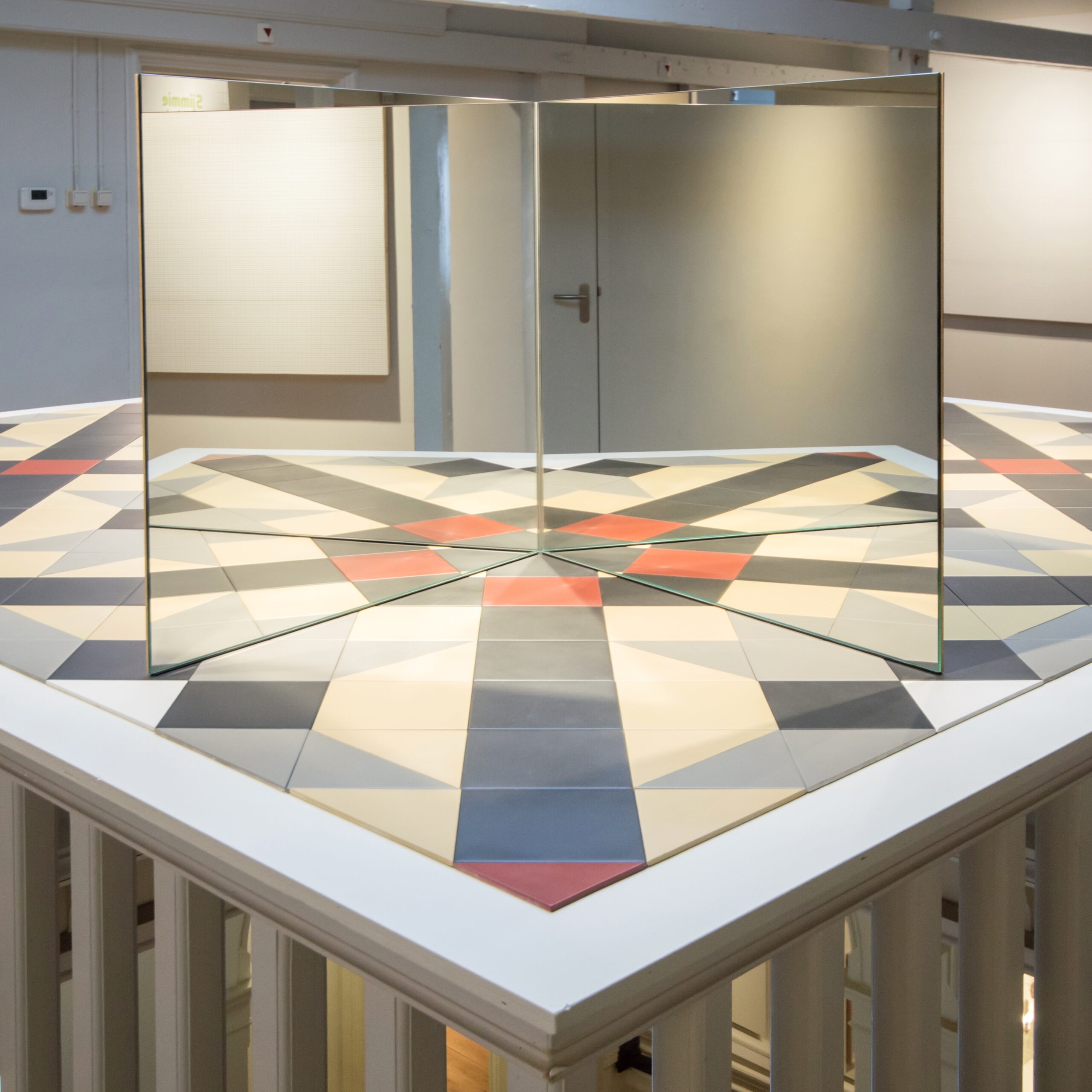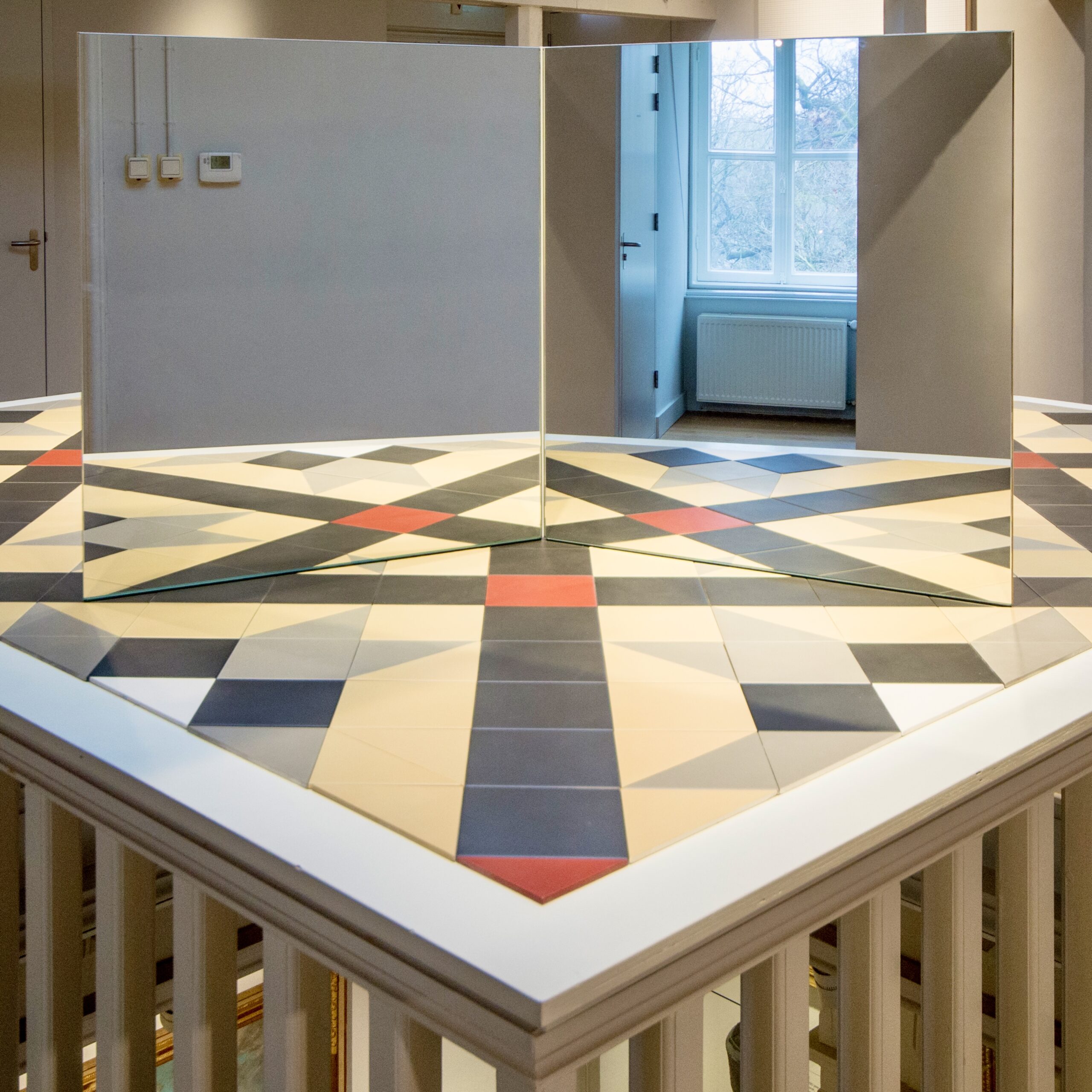 Sjimmie Veenhuis is one of them. Even while he is building the exhibition, he continues to make new discoveries with them. Veenhuis takes off his shoes to step onto the pattern of tiles he has laid down. It rests on the balustrade of the top floor of the Jan Cunen Museum, his knees on a cushion that keeps the tiles neat. On the surface he very precisely installs some mirrors, which extend and distort the pattern in interesting ways. Even while building up the exhibition he continues to make new discoveries with them.