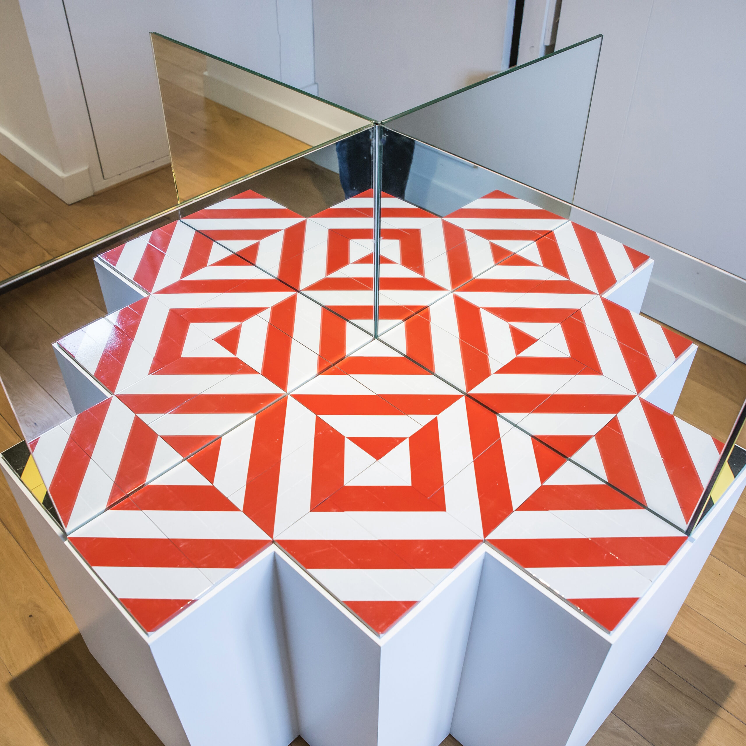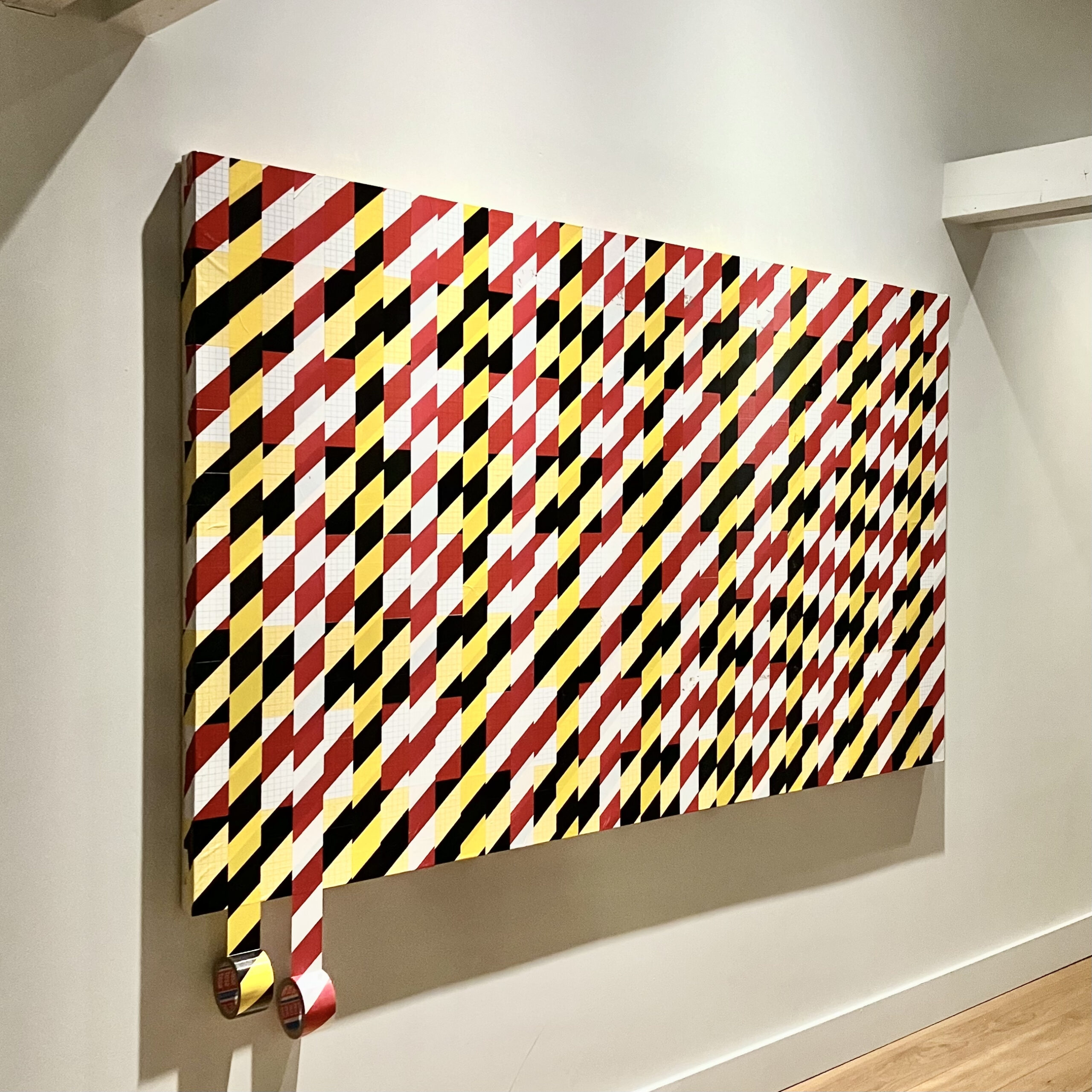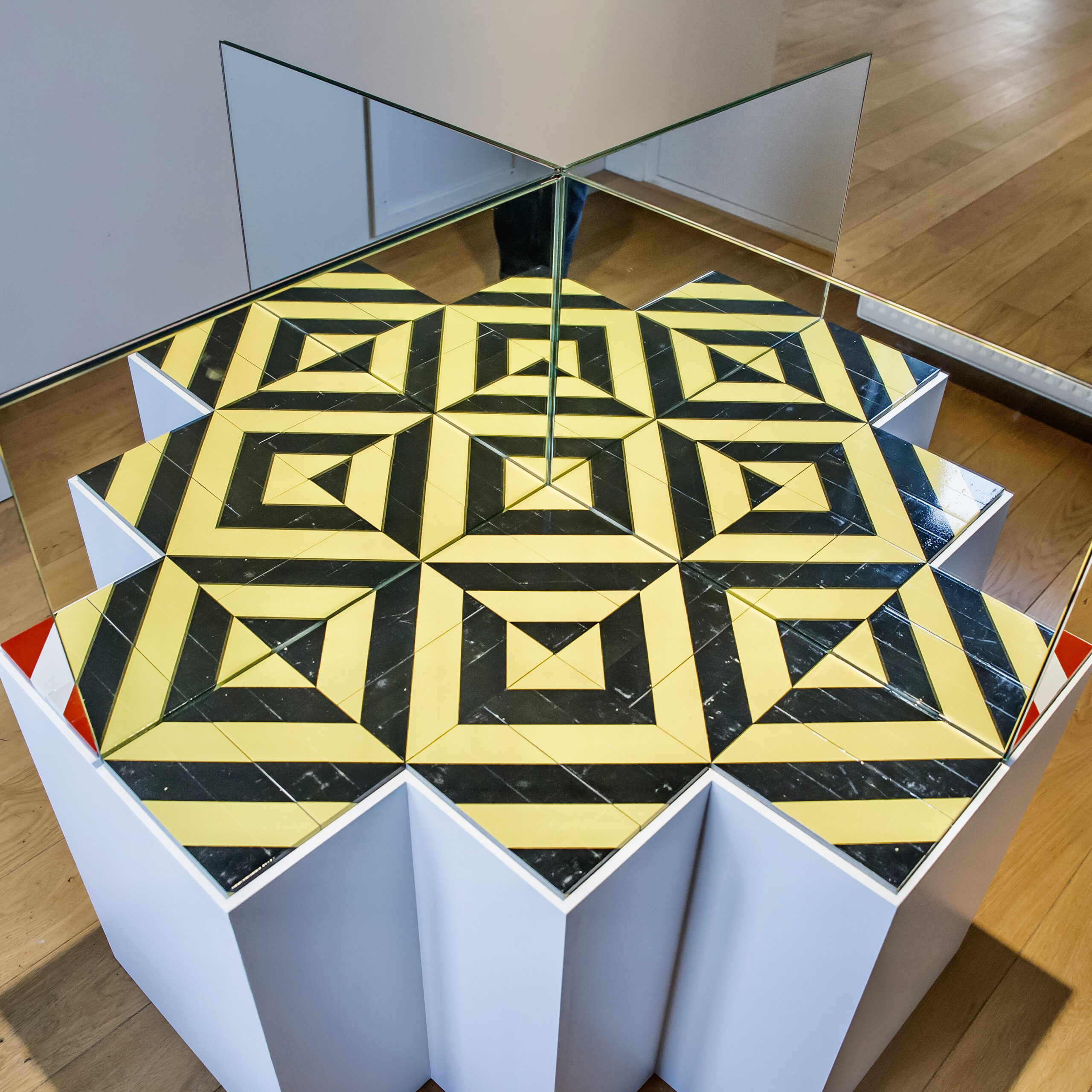 He will work with tape on the empty panels around his mirror installation every month. Visitors can thus see compositions inspired by Bergoss being created on the spot.