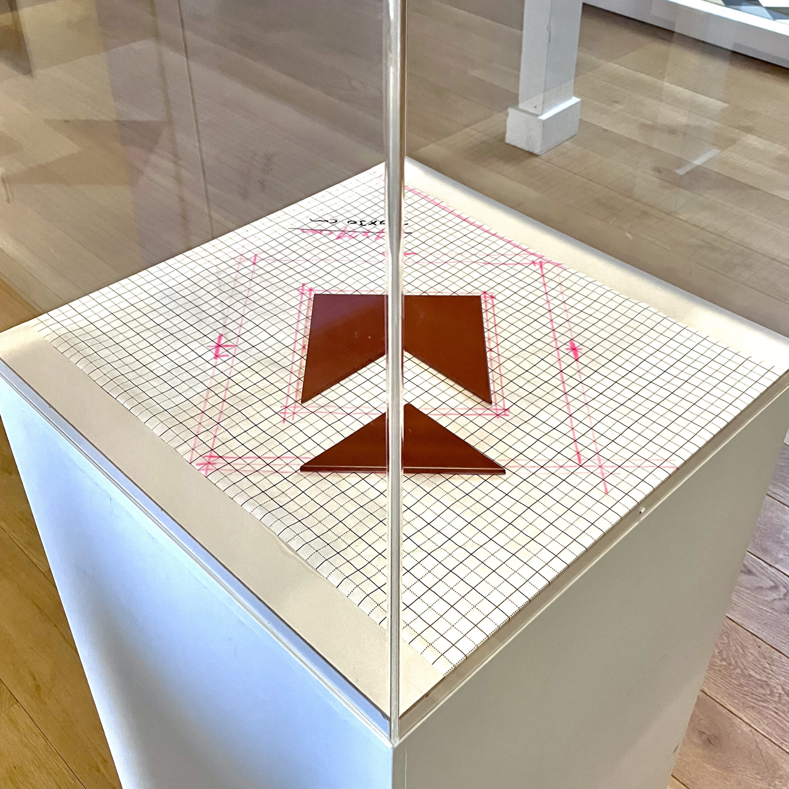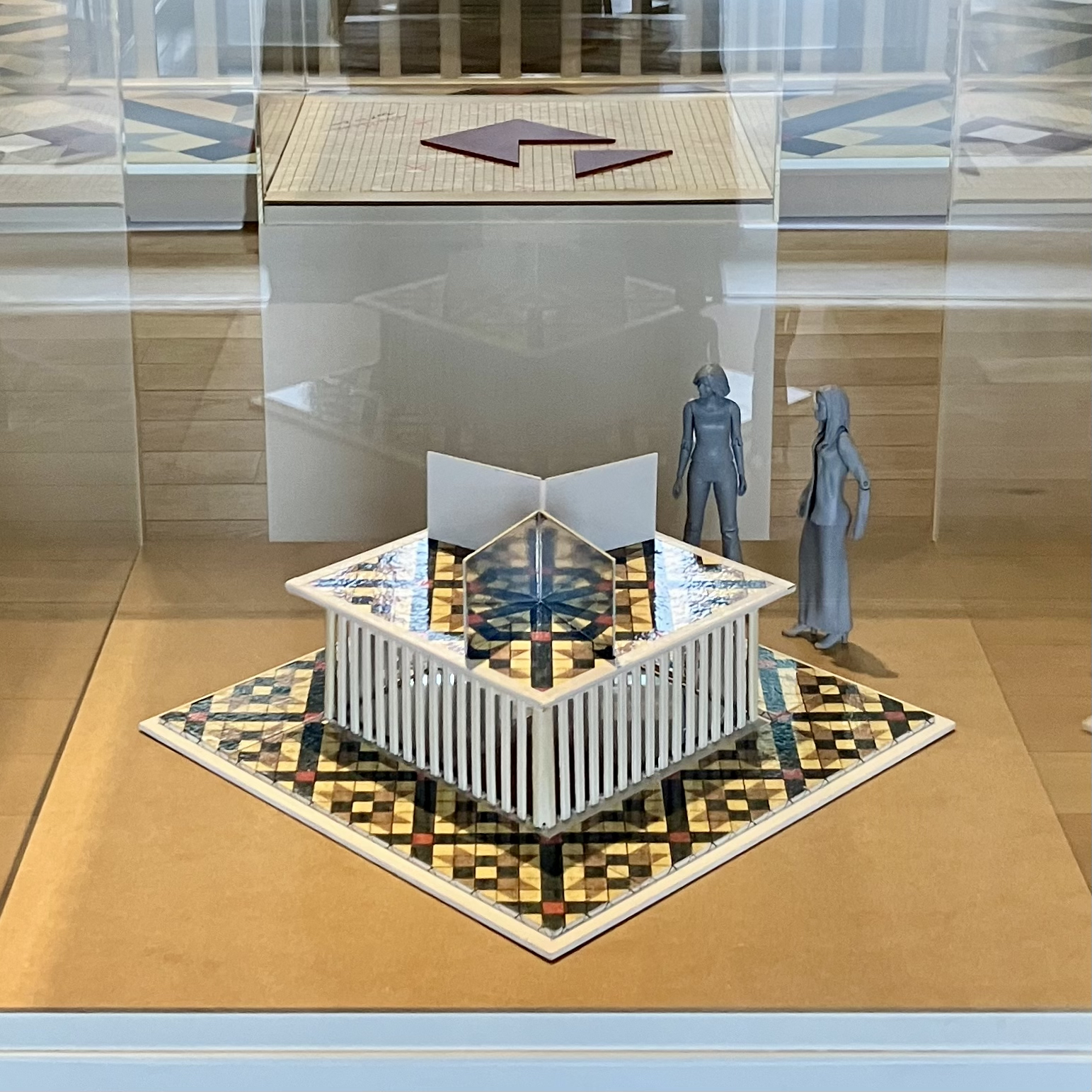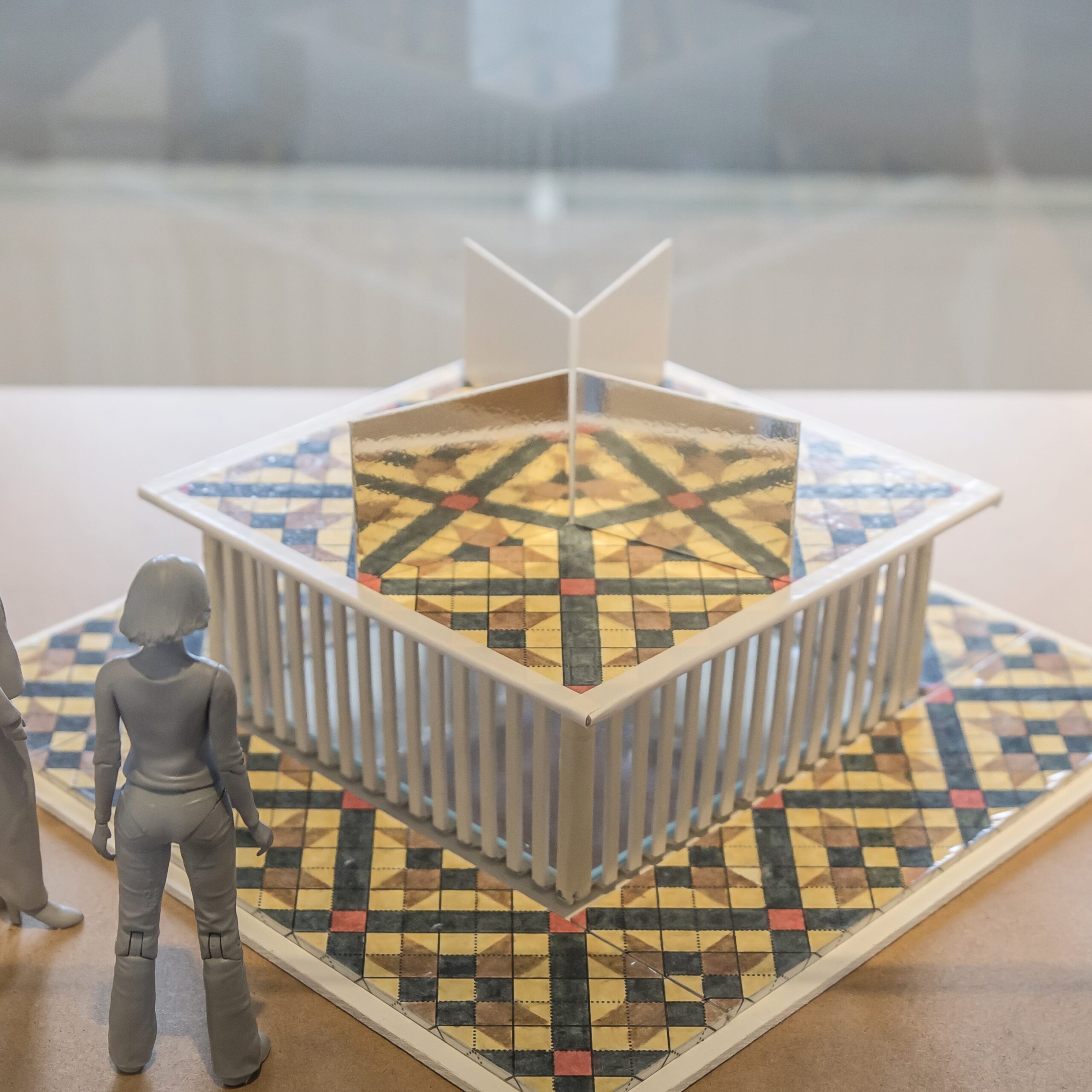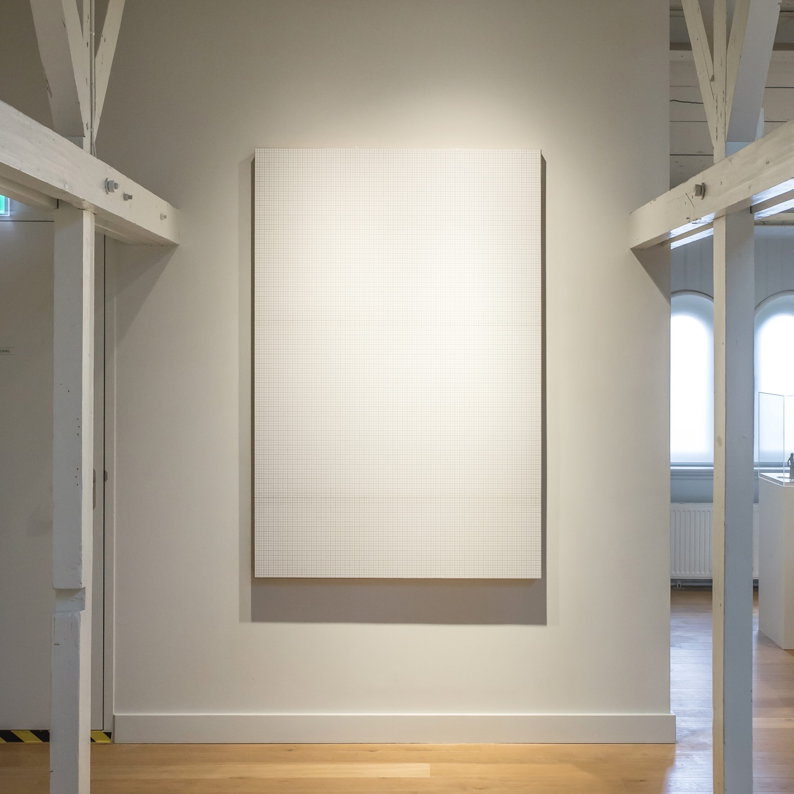 I just found another connection,” he exclaims as he talks about it. “Those tiles in de middle part of the pattern now have a pedestal on which the work rests, and the four pillars on the real floor are exactly below that.” The artist thus tumbles from one parallel to the next. A direct result of working according to fixed patterns, as he often does.