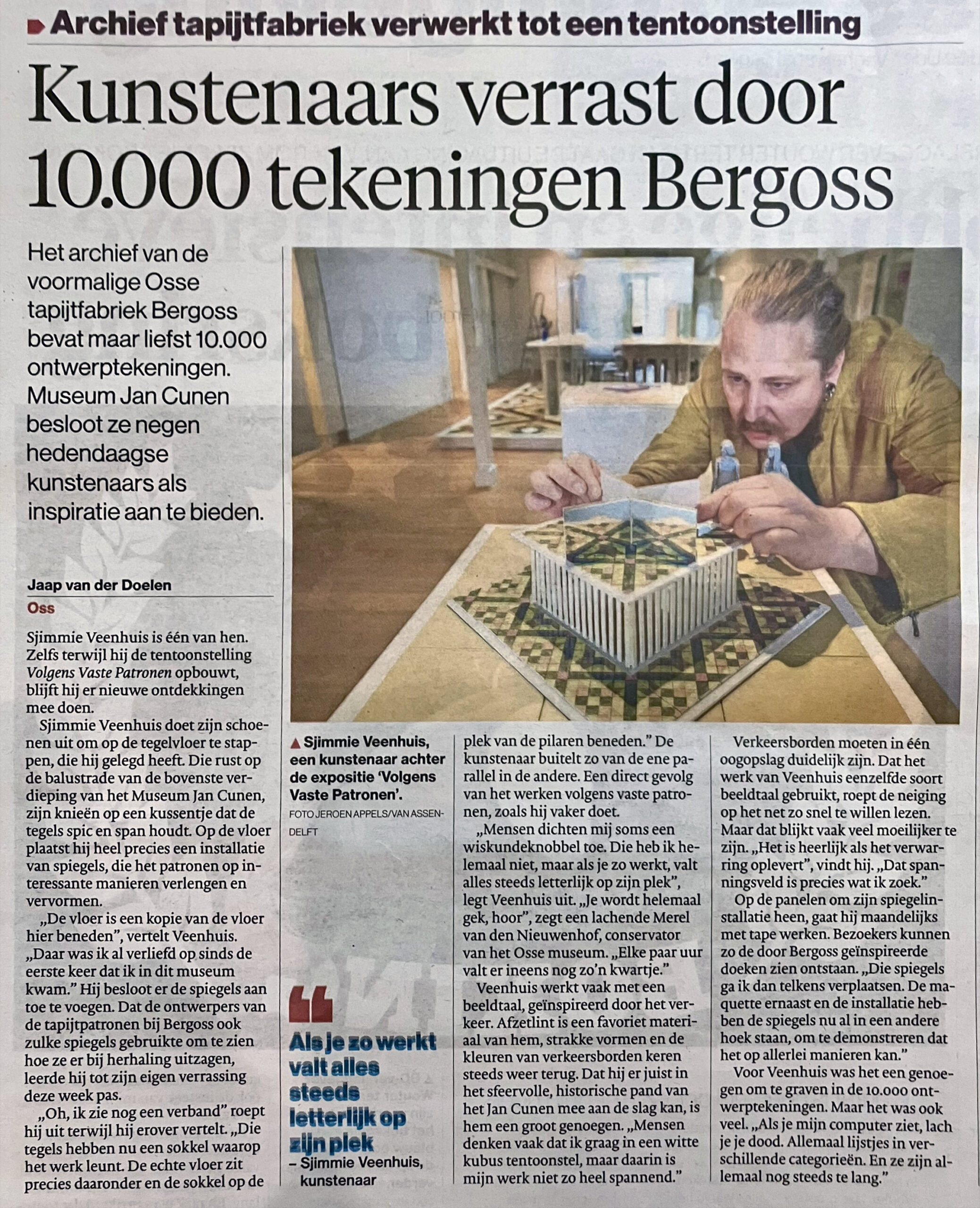 “Museum Jan Cunen in Oss possesses ten thousand design drawings of the former Bergoss carpet factory, which went bankrupt in 1982. Nine contemporary artists have worked their way through these Bergoss designs. Their reflections on this Osse legacy can be seen in the exhibition ‘According to Vaste Patterns’ Explosions of color, moments of tranquility and a tribute to the unknown masters of Bergoss.” [1]