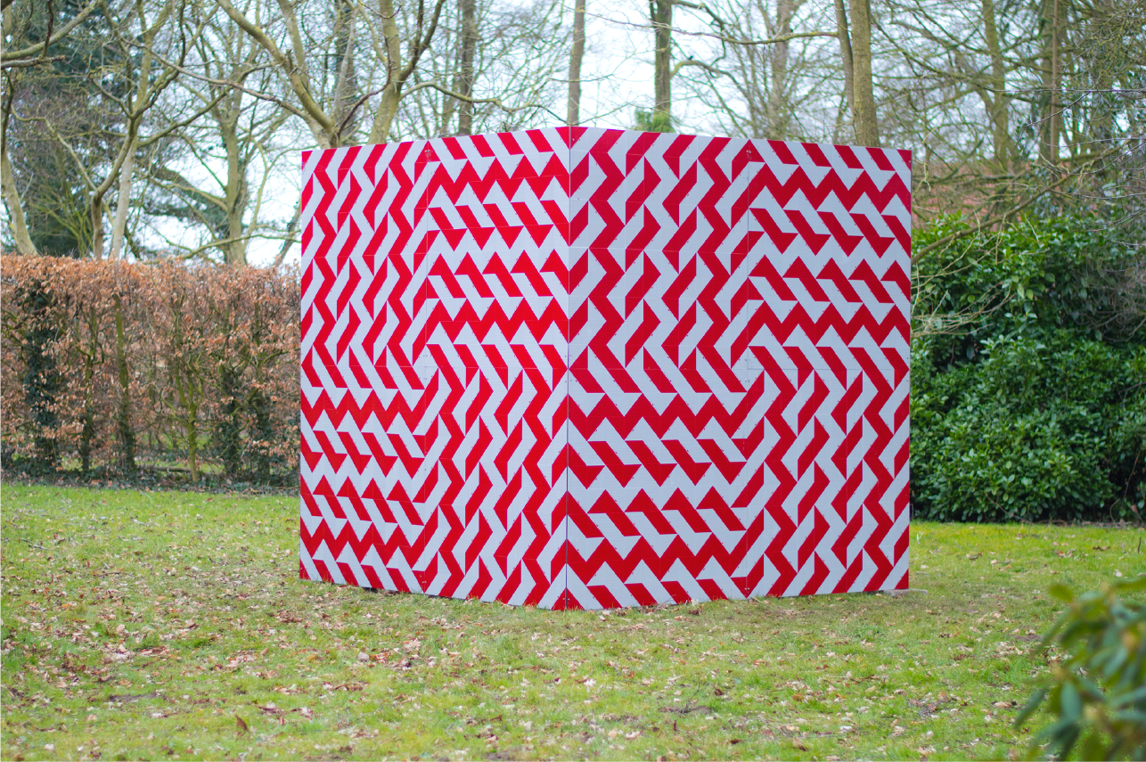 The first thing you notice in his studio are plastic crates with vinyl records, neatly in a row, as if it were an installation. Next you find rolls of tape hanging on the wall, also carefully sorted, like a composition. The third thing you notice is a square plate of aluminium, a ‘board’, covered with material reminiscent of traffic signs and geometry. Here is someone at work who likes order and control. “Sorry for the mess,” says Sjimmie Veenhuis, without moving a muscle. He means it, order is a central element in Veenhuis’s work. The ‘board’ turns out to be a part of a large sculpture. Veenhuis picks up his phone to show what the intention is: a large and shiny cube of 3 by 3 meters with lines that occur to be swirly. [1]